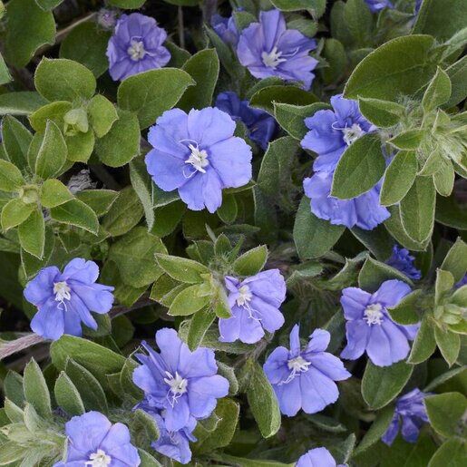 Evolvulus ‘Beach Bum Dwarf’ is a compactcomma-sign low-growing variety of the popular Blue Daze plant. Known for its vivid blue flowers and spreadingcomma-sign mounding growth habitcomma-sign it is perfect for adding vibrant color to containerscomma-sign hanging basketscomma-sign and as ground cover. This plant thrives in full sun and is well-suited for warm climatescomma-sign making it a great choice for gardeners looking for a low-maintenance yet colorful addition to their landscape.