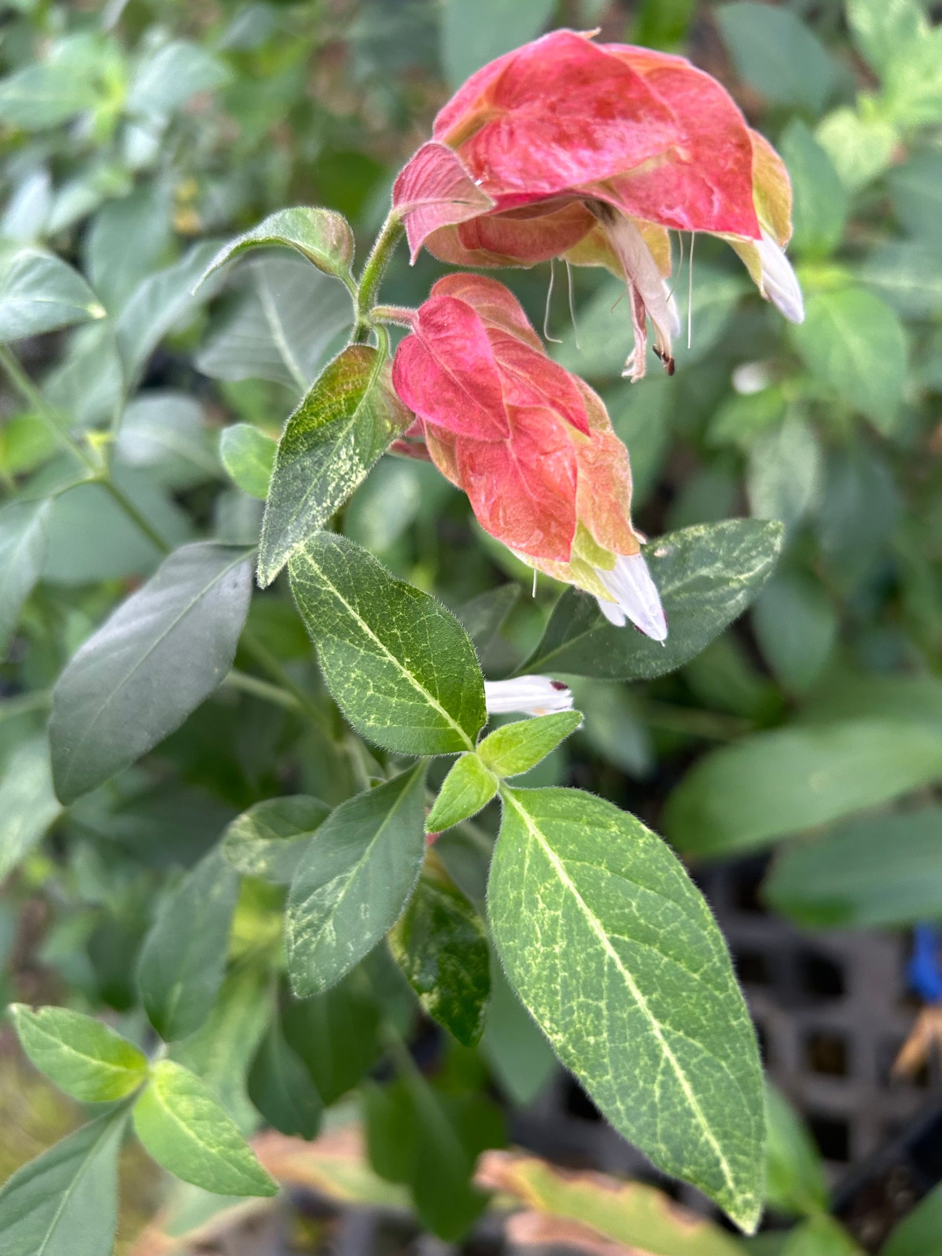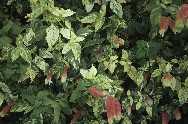 Justicia brandegeeana ‘Variegated’, commonly known as Variegated Red Shrimp Plantcomma-sign is a beautifulcomma-sign tropical shrub with striking variegated foliage and red shrimp-like flowers. This variety of Justicia offers the same uniquecomma-sign shrimp-like appearance as the regular Red Shrimp Plantcomma-sign but with the added bonus of variegated green and cream-colored leaves that create a stunning contrast with the bright flowers.